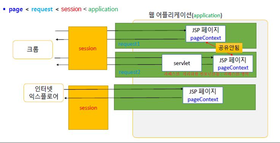 하나의 JSP 페이지 범위, 페이지 간 공유가 안됨.