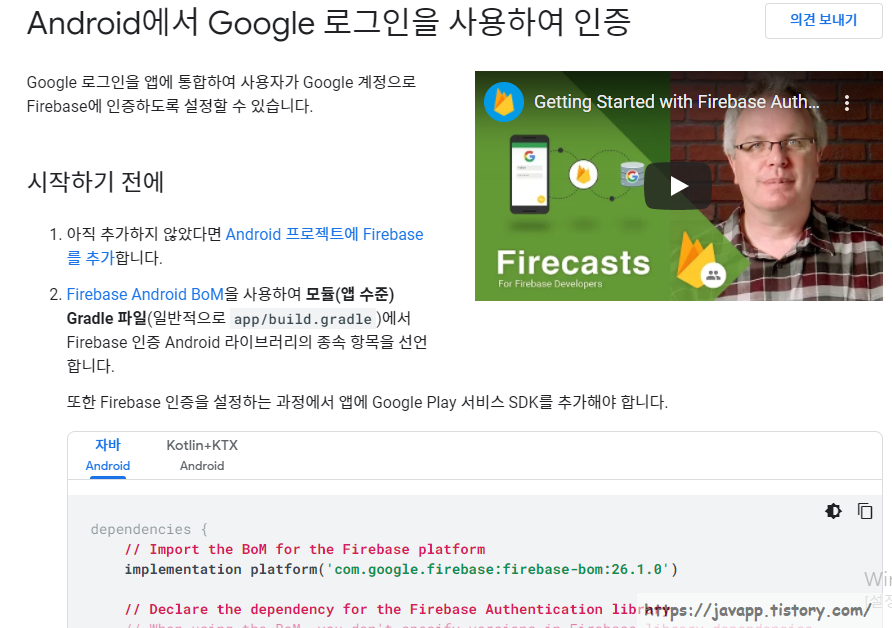 Firebase 인증 Android 라이브러리의 종속 항목을 선언한다.