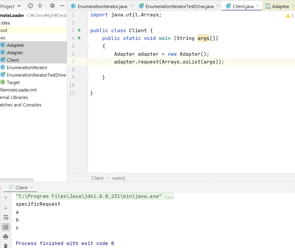 Adapter 에 Client가 원하는 메소드를 가지고 있고, 호출 시 Adaptee의 메소드를 호출한다.