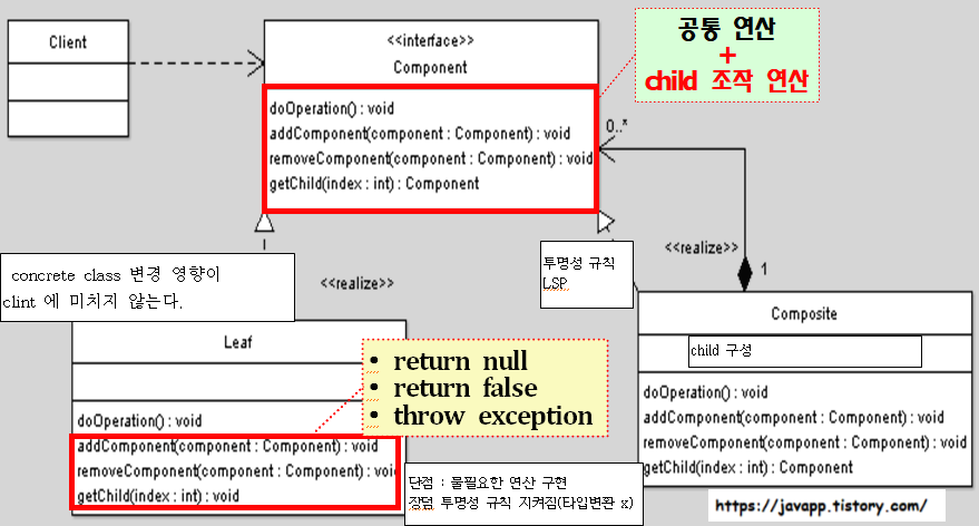 child 조작 연산 (add, remove) 실행 時 “type casting”이 요구됨. (NOTE) 투명성 규칙에 위배됨