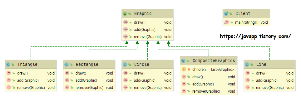 선언타입(interface)으로 객체 생성 -> add 호출 불가 -> CompositeGraphics에 있기 때문에 타입 변환 필요