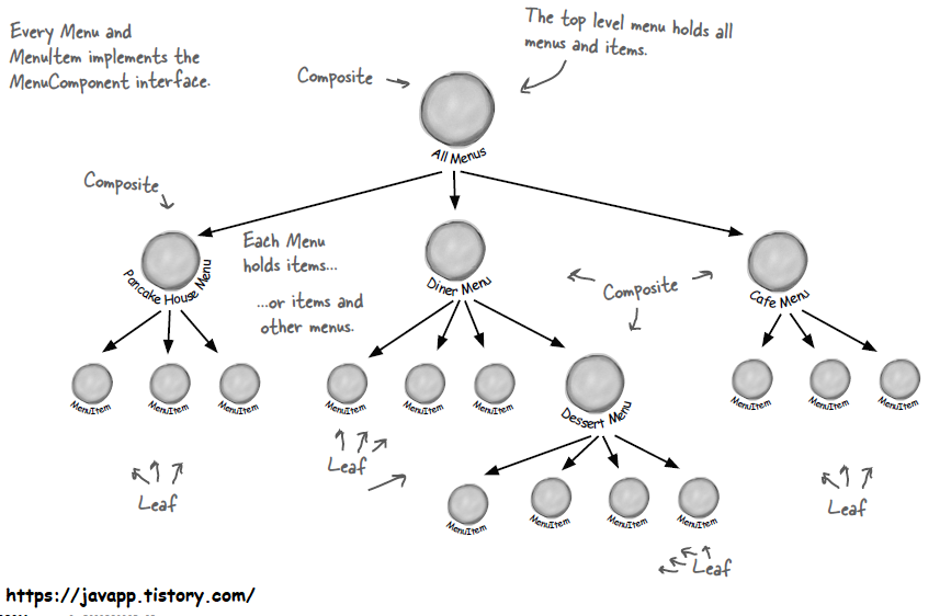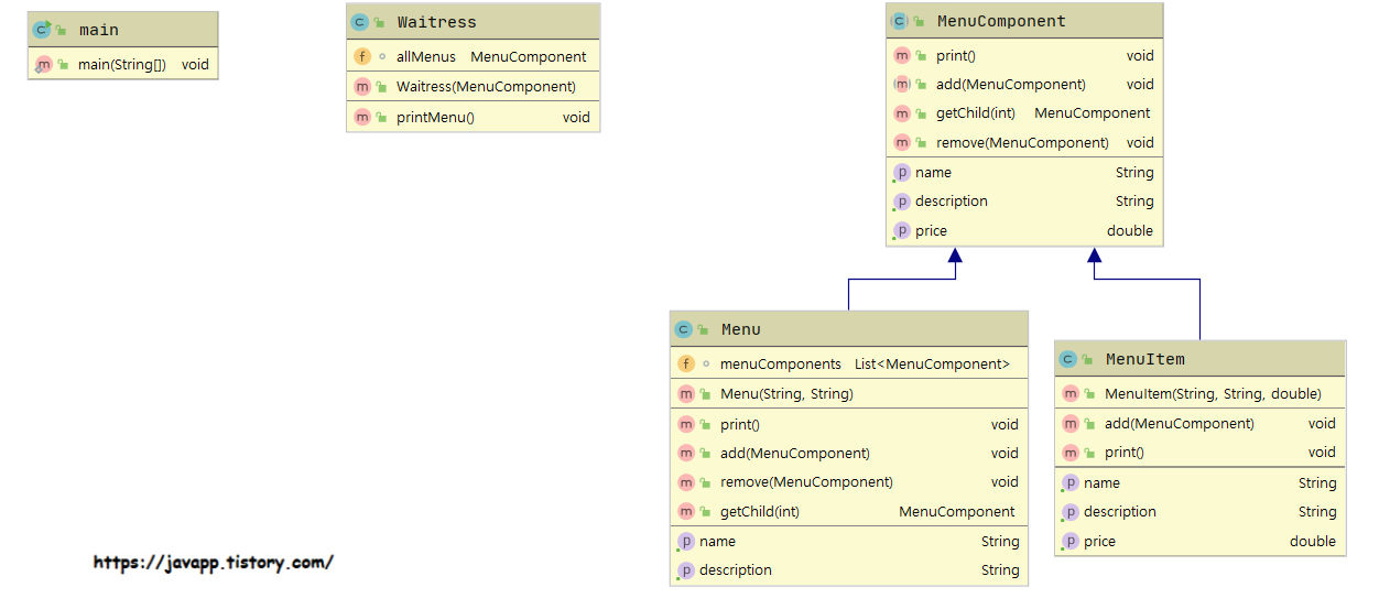 Waitress는 MenuComponent 인터페이스/추상 클래스 를 통해 Menu 와 Menuitems에 access 한다.