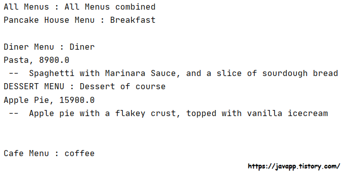 MenuComponent dessertMenu = new Menu("DESSERT MENU", "Dessert of course");