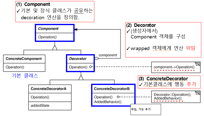 ConcreteDecorator : 기본 클래스에 행동을 추가 구현