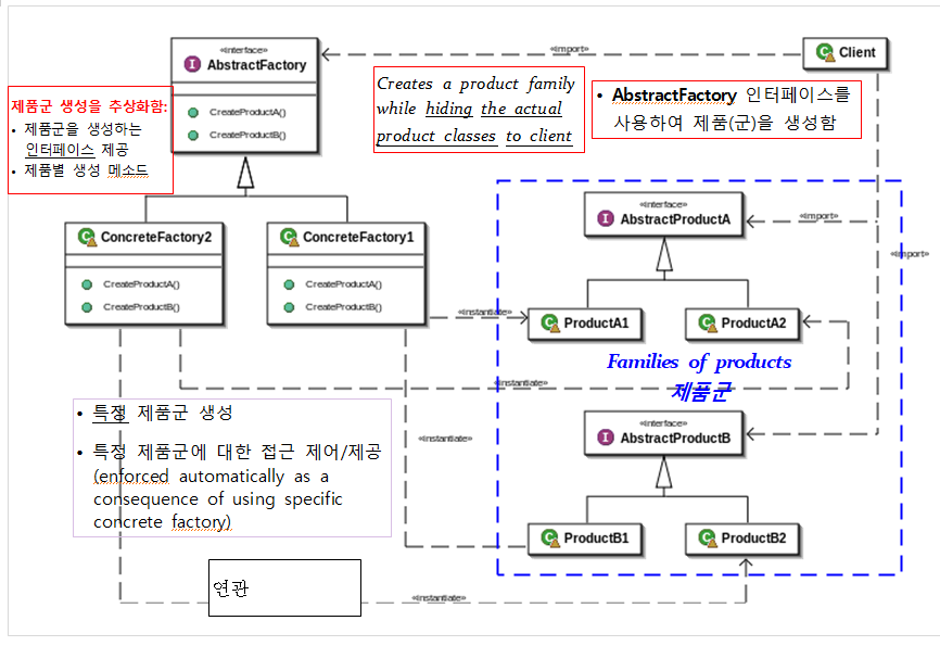 - Abstract factory : 제품군의 각 제품을 생성을 위한 인터페이스를 제공