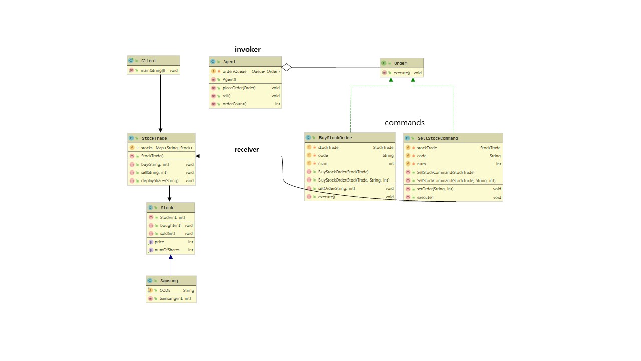 - client는 주식 매수 주문서 (concrete command: BuyStockOrder), 주식 매도 주문서 (concrete command SellStockOrder) 생성