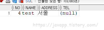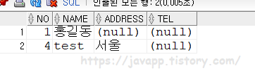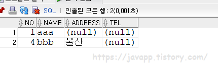 INSERT INTO test1 (NO, NAME ,address) VALUES(4, 'bbb','울산');