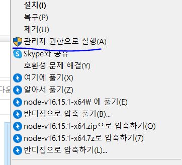 노드 설치 중에 오류가 생겼었는데 관리자 권한 설치고 문제 해결