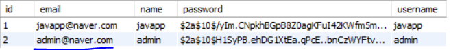 MySql을 참고해 확인해보면 email(admin@naver.com) 값이 가져와졌는데..