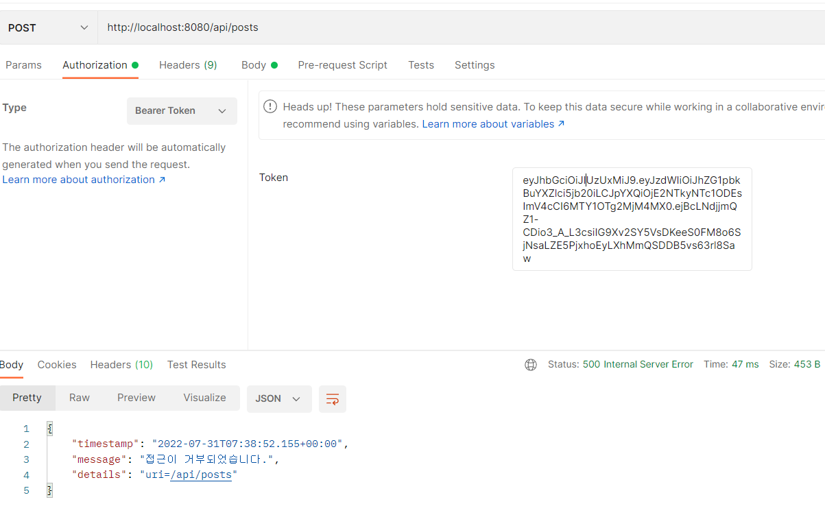 파라미터에 @RequestHeader("Authorization") String jwtToken 추가