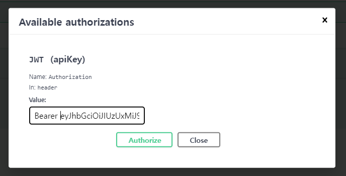 헤더에 "Authorization" 키의 값으로 JWT 토큰이 포함되어 있어요.