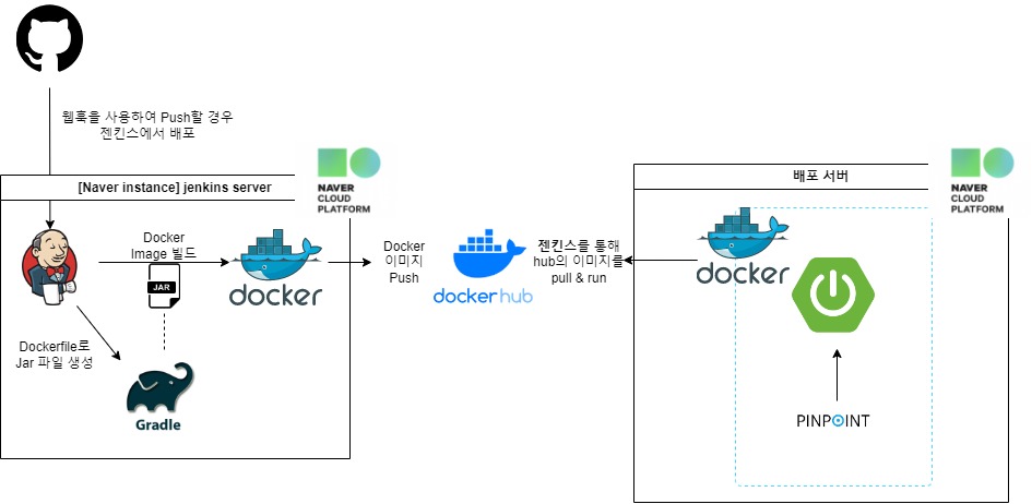 - 배포 서버에서 젠킨스를 통해 원격으로 DockerHub의 jar 를 pull & run 하여 도커 컨테이너로 Spring Boot 를 실행합니다.