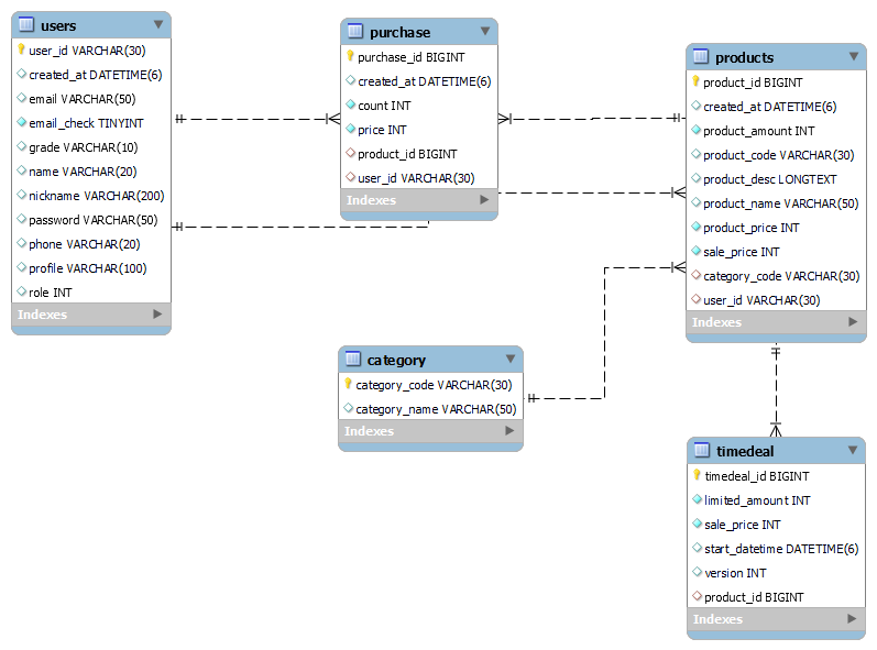 - 한 상품으로 여러 타임테이블을 생성할 수 있다고 생각하여 상품과 타임딜 테이블을 1:N으로 설정했습니다.