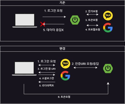 그래서 로직을 변경해서, 기존에 백엔드 에서 리다이렉트를 받아 진행하는 것이 아니라 프론트엔드에서 소셜로그인을 한후 리다이렉트를 통해 받은 code를 통해 서버 토큰을 받도록 하였습니다.