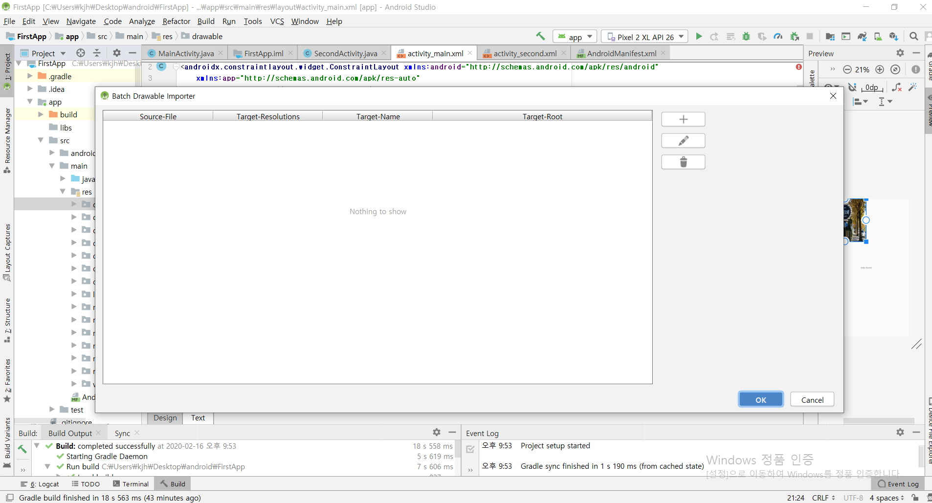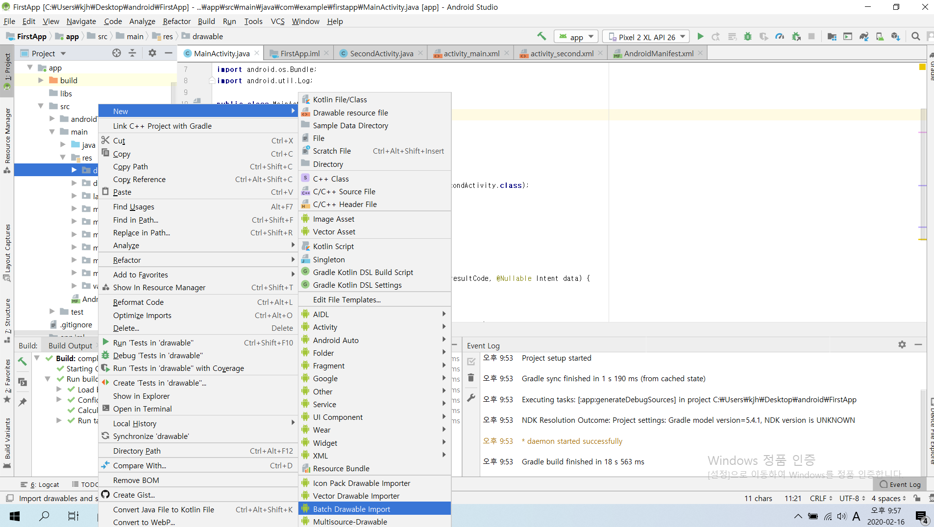 drawable 파일에 넣기 : drawable 폴더 (마우스 오른쪽 – New – Batch Drawable Import