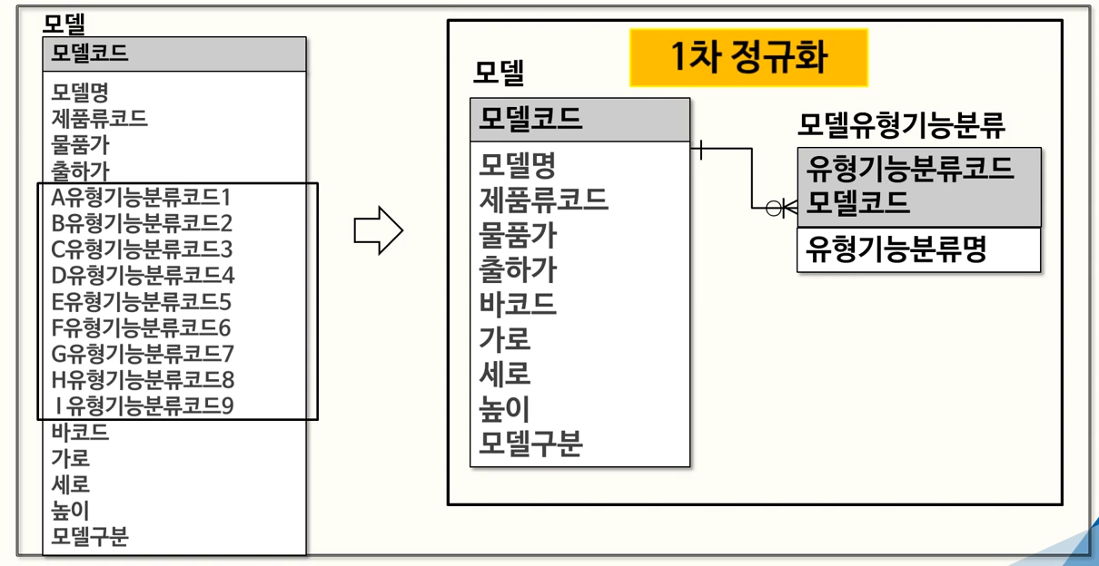 속성이 원자값(Atomic Value)을 갖도록 함. "기본키" 보유, 같은 성격과 내용의 속성이 중복