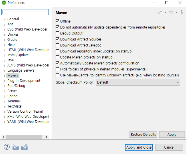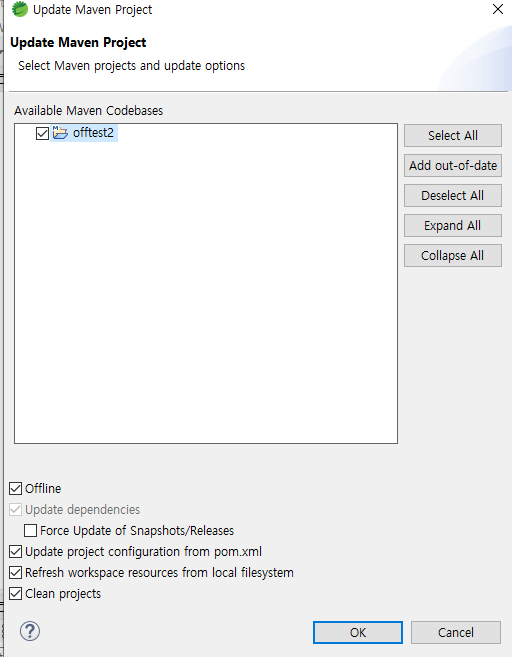 > Maven > Update Project > Offilne 체크 확인 후 OK