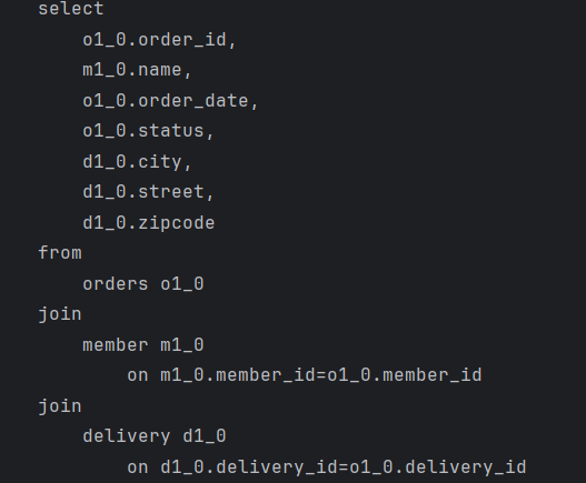"select new com.inflearn.optimization.domain.order.repository.query.OrderQueryDto(o.id, m.name, o.orderDate, o.status, d.address) from Order o " +