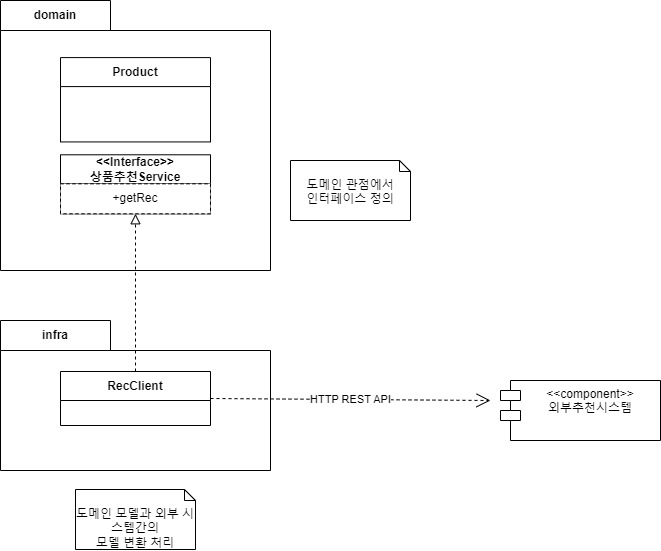 RecClient 는 외부 시스템과의 연동을 처리하는데 외부 시스템의 도메인 모델이 내 도메인 모델을 침범하지 않도록 막아주는 역할을 한다. 안티코럽션 계층이 된다.