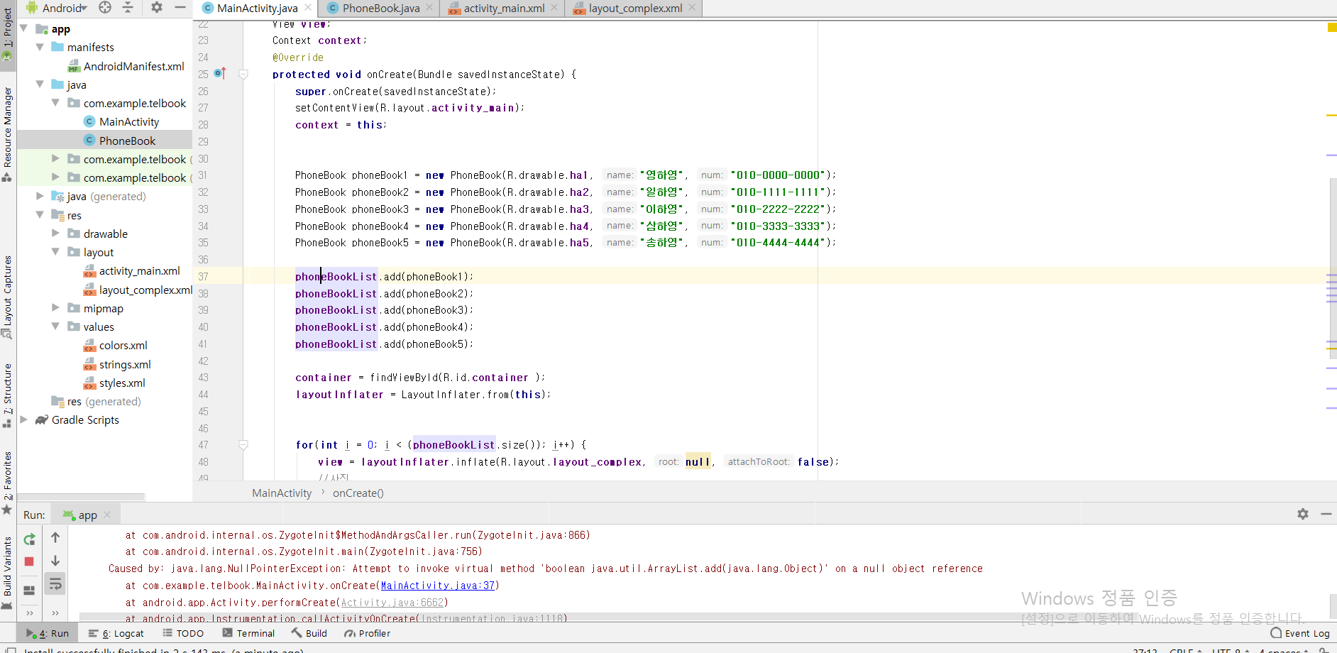 at com.example.telbook.MainActivity.onCreate(MainActivity.java:37)