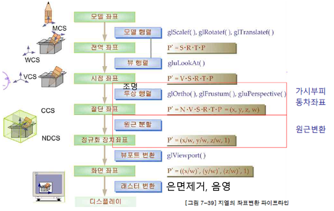 후면제거 -> 절단 -> 3차원공간(원근분할) -> 은면제거 -> 투상